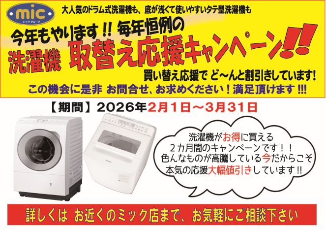 洗濯機買い替え応援キャンペーンやってます! お買い得情報 2025/02/18 【期間:2月1日(土)~3月25日(火)】 今、ドラム洗が洗濯機の中でも数多く売れています!特におすすめする機種、LX127DLは、洗剤・柔軟剤・漂白剤(おしゃれ着洗い洗剤)を自動で投入してくれる機能が付いており大好評で […] » 続きを見る